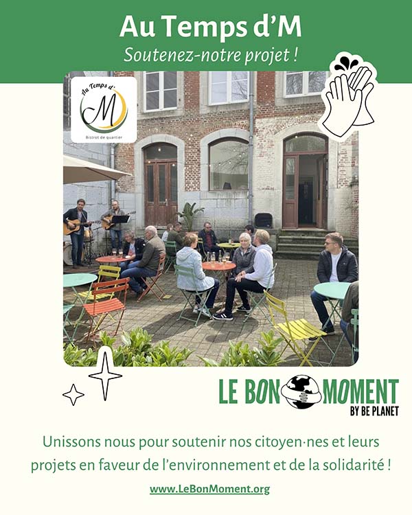 Au temps d’M est un bistrot citoyen et un lieu de vie en train de naître au cœur de Malonne, porté par un groupe d’habitantes et d’habitants motivés. L’idée est simple : recréer un endroit où l’on peut se retrouver facilement, prendre le temps d’échanger, partager un verre, une idée ou un projet, et renforcer les liens dans le village.